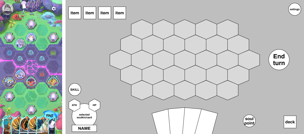 As combat mechanics evolved, the game design moved away from cards in favor of a summonable team of soulkin. In response, the interface was restructured to surface the team as an always-visible element, while redistributing abilities, items, and turn controls to reduce vertical congestion and improve readability during combat.